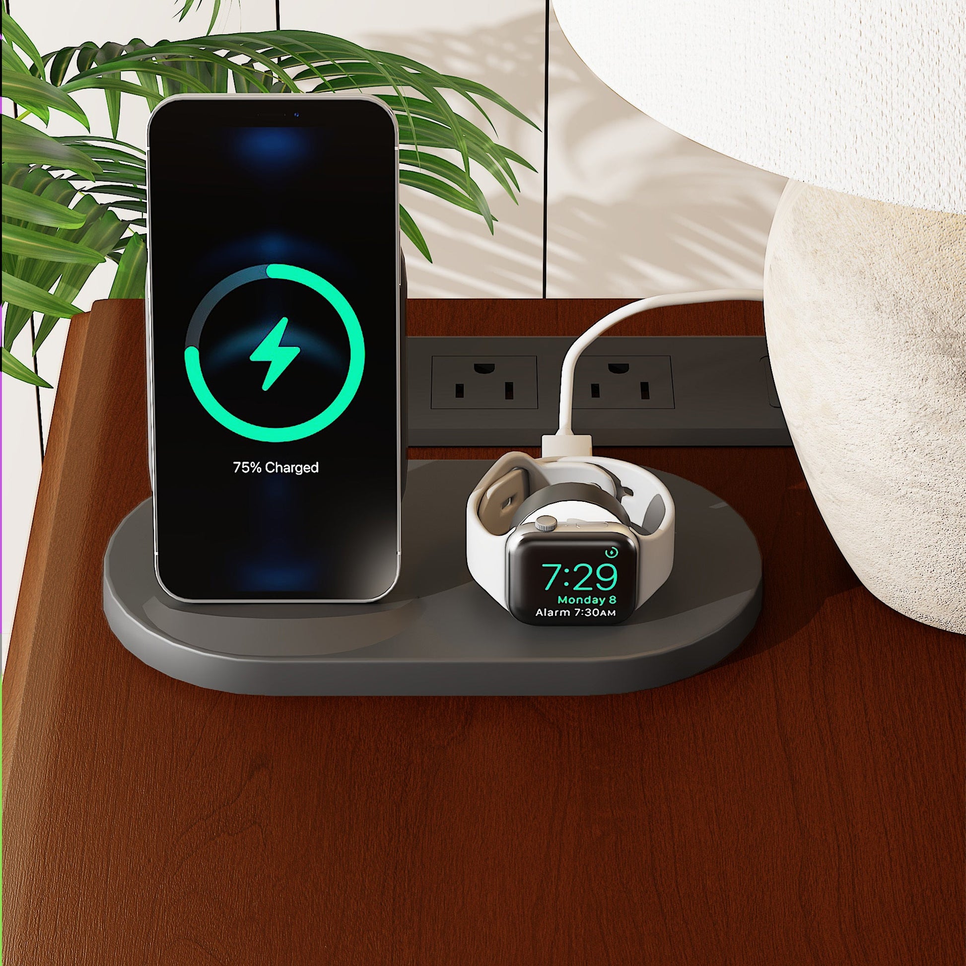 Adding to its contemporary appeal, the lower large drawer is designed with a unique linear concave pattern that looks elegant and stylish. A key feature for modern convenience is the integrated charging station, which includes 2 AC outlets and 2 USB ports, allowing you to power up your devices right next to you.