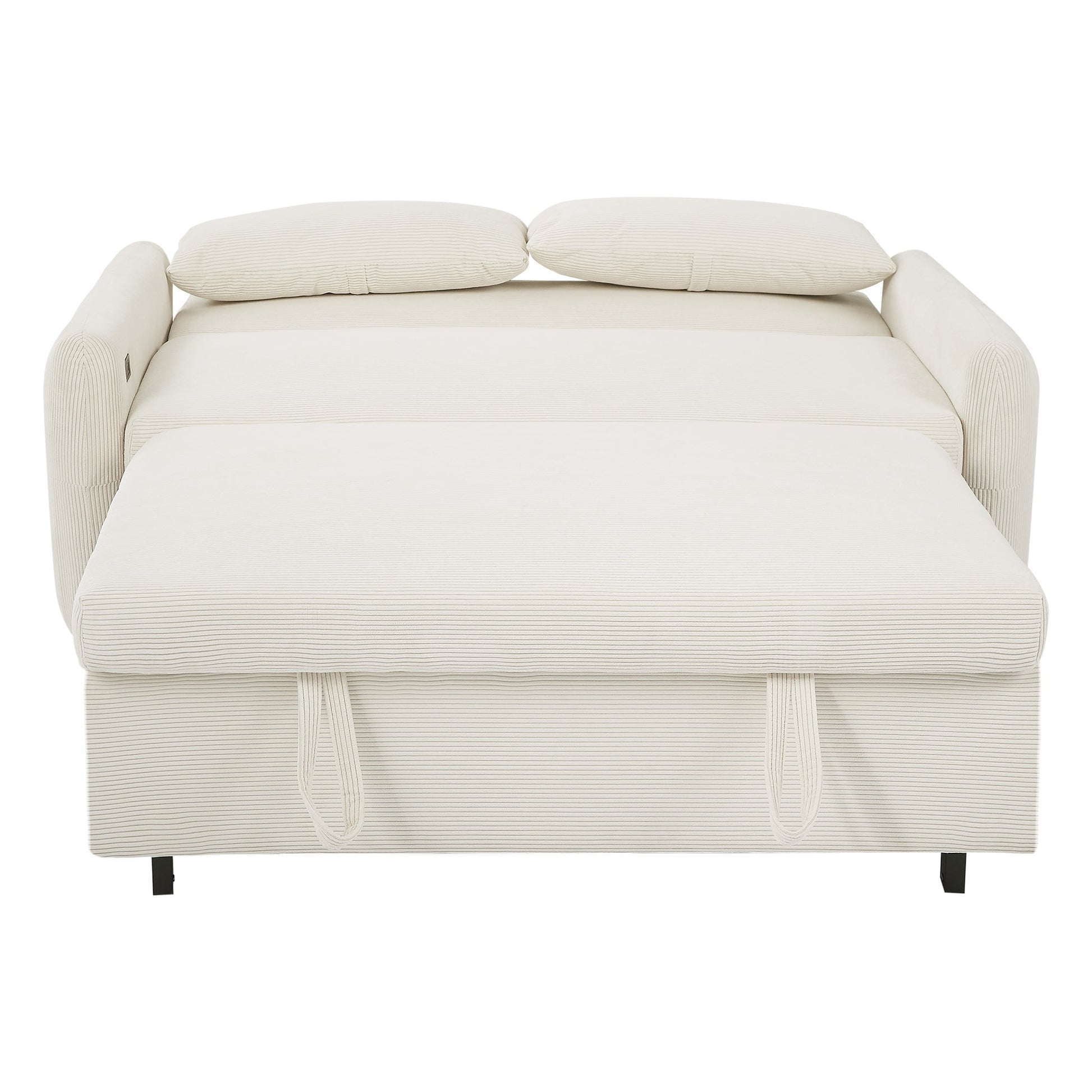 57.48" Modern Beige Corduroy Pull-Out Sofa Bed with USB Ports Bring a sense of calm and effortless style to your home with this versatile beige loveseat. Wrapped in a soft, premium corduroy that offers a cozy, vintage-inspired texture, this sofa is the ultimate multitasker for smaller spaces. Whether you’re lounging with a book, charging your phone via the built-in USB ports, or hosting an overnight guest, its seamless transition from sofa to sleeper ensures comfort never takes a back seat to style.