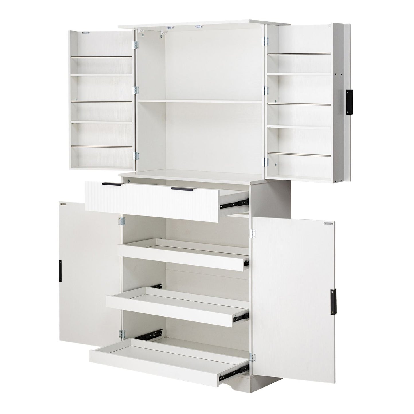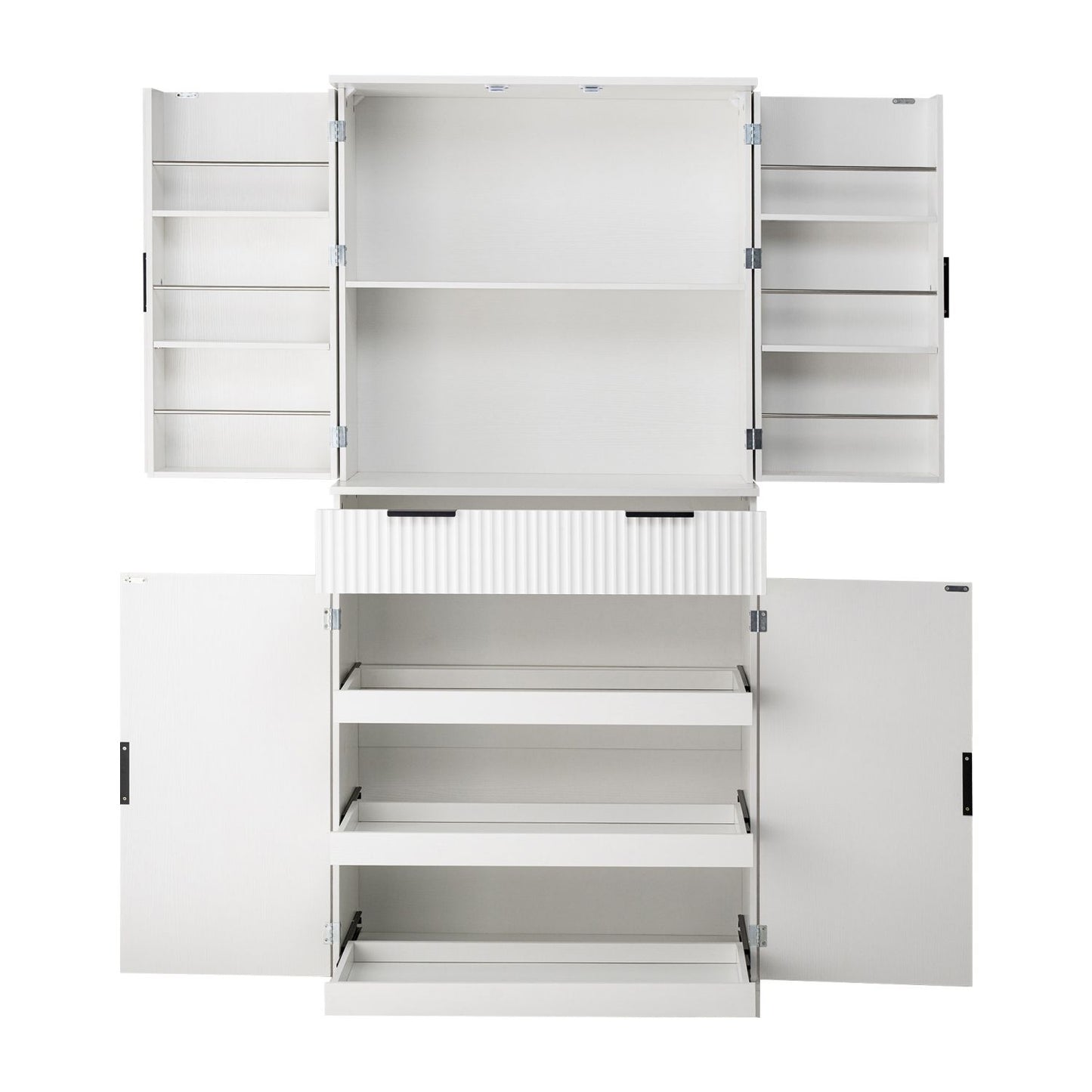 Bring exquisite design and ample storage to your kitchen with this Pristine White Farmhouse Kitchen Pantry Cabinet. This storage solution is meticulously crafted to help you organize your food, dinnerware, and kitchen appliances, all while adding a touch of elegant, rustic charm to your home.