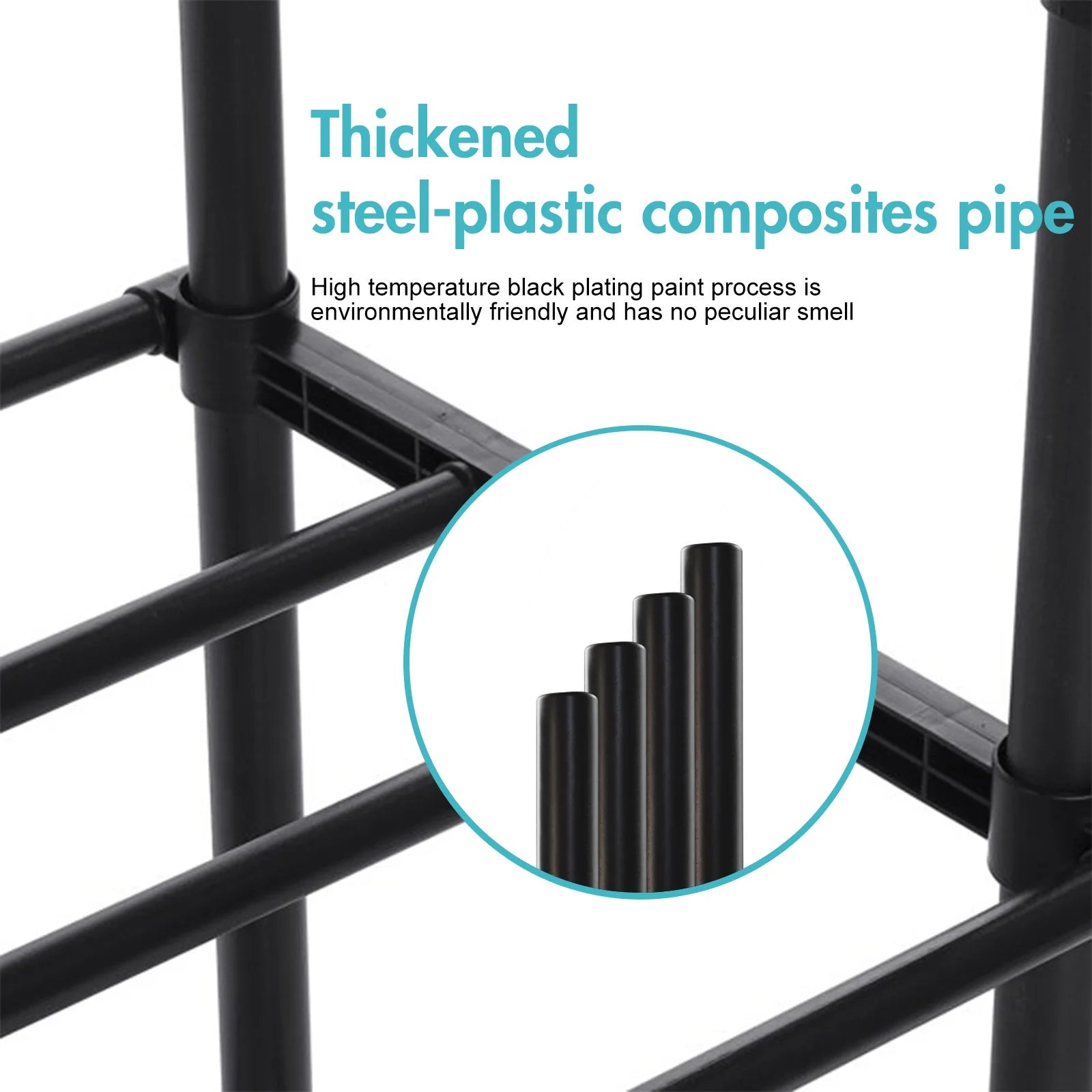 Organize your wardrobe in style with this double rail garment rack. Made from strong steel-plastic composite pipes with ABS joints, this rack offers excellent durability, rust resistance, and stability. Designed with two adjustable hanging poles, a lower storage shelf, and smooth-rolling wheels, it’s a versatile solution for clothes, shoes, and accessories in any room of your home.