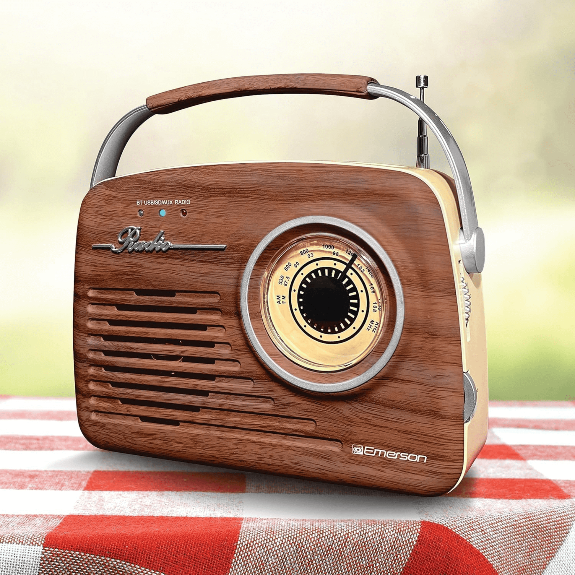 Emerson Retro Radio Bluetooth 5.0 Portable AM/FM Rechargeable Analog Wood Finish