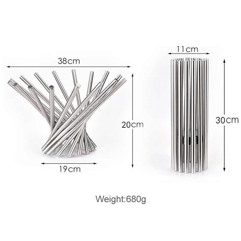 This is more than just a fruit bowl; it's a conversation-starting modern sculpture for your kitchen or dining table. The interesting and unique design features a series of geometric stainless steel spokes that, with a simple twist, magically transform from a flat, decorative object into a beautiful, open-work fruit bowl.