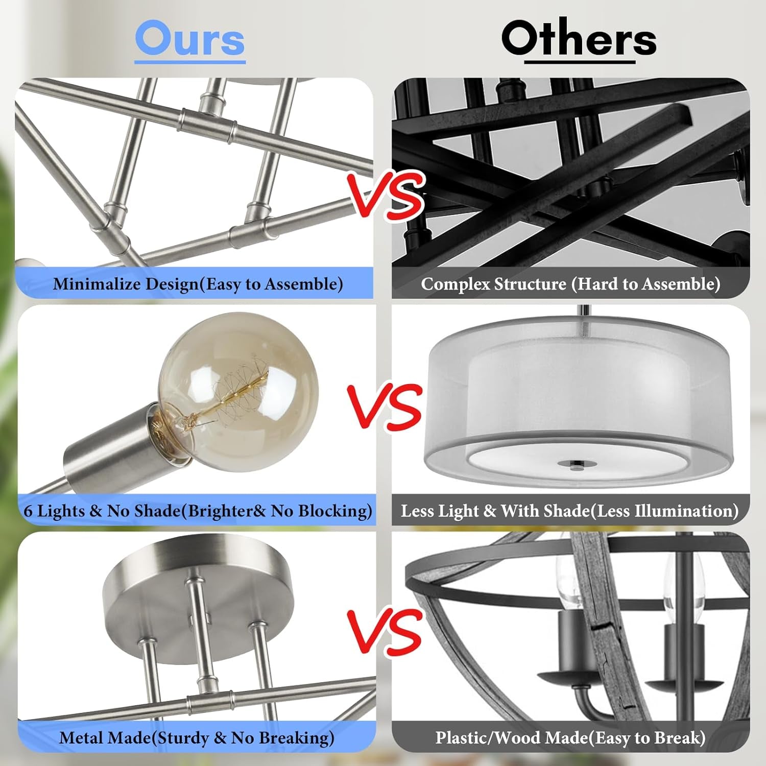 Crafted from durable, anti-rust metal, this chandelier offers long-lasting quality and a brushed nickel finish that complements a wide range of interiors—from sleek modern lofts to cozy farmhouse homes. With six adjustable arms and an open design, it delivers abundant illumination while letting you customize the direction of light to suit your space.