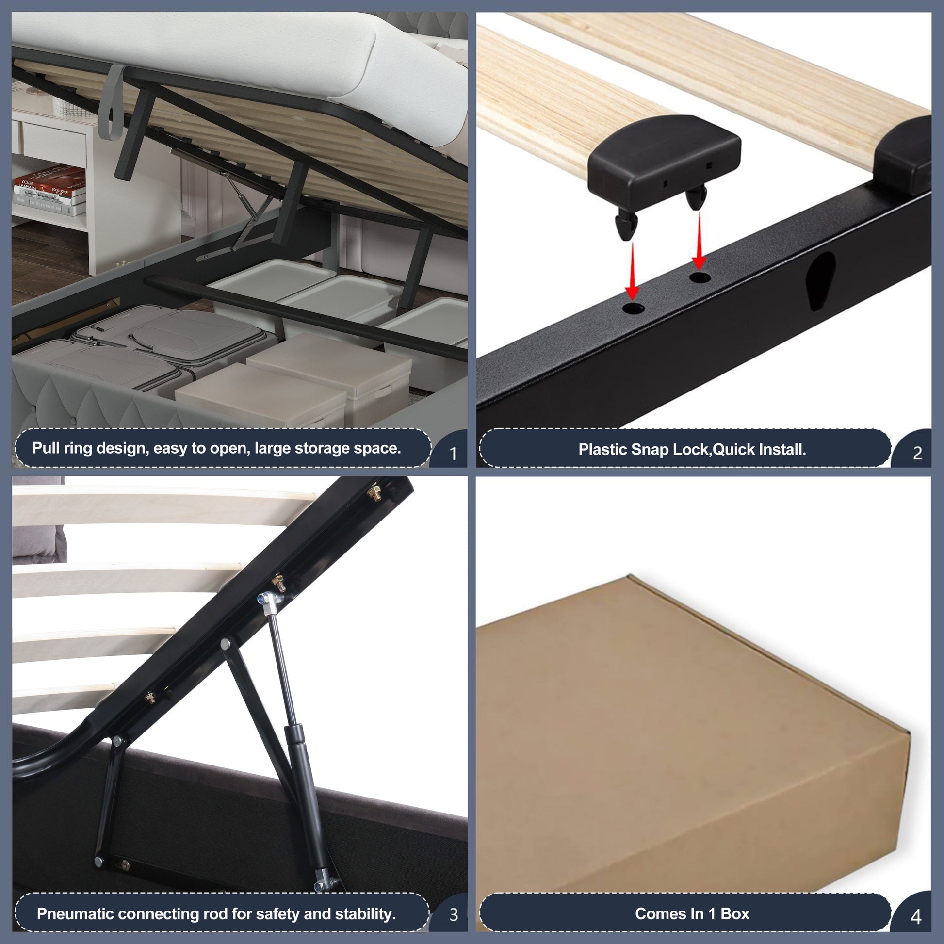 - Storage: Lift-up underbed storage with pneumatic hydraulic system
