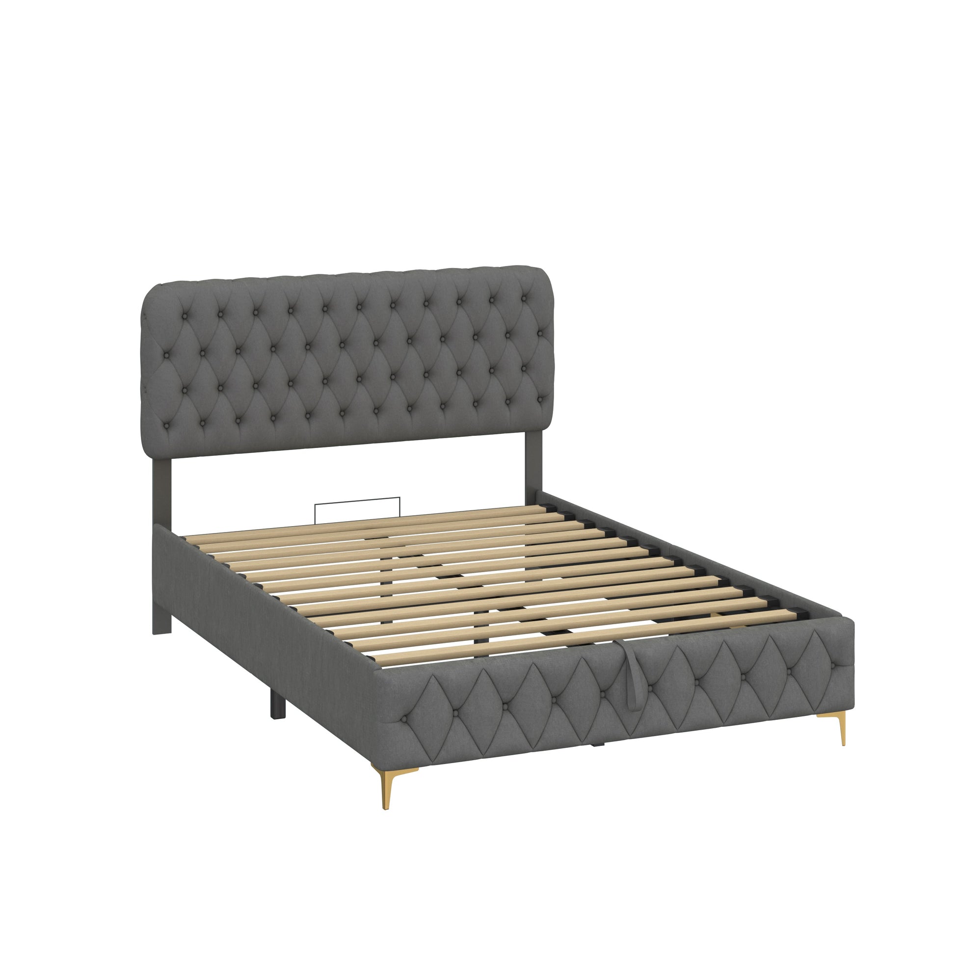 Built for comfort and longevity, the sturdy frame features hardwood slats and a reinforced locking system designed to reduce noise and increase stability. Gold-toned feet add a subtle touch of polish, grounding the design with just the right amount of contrast.