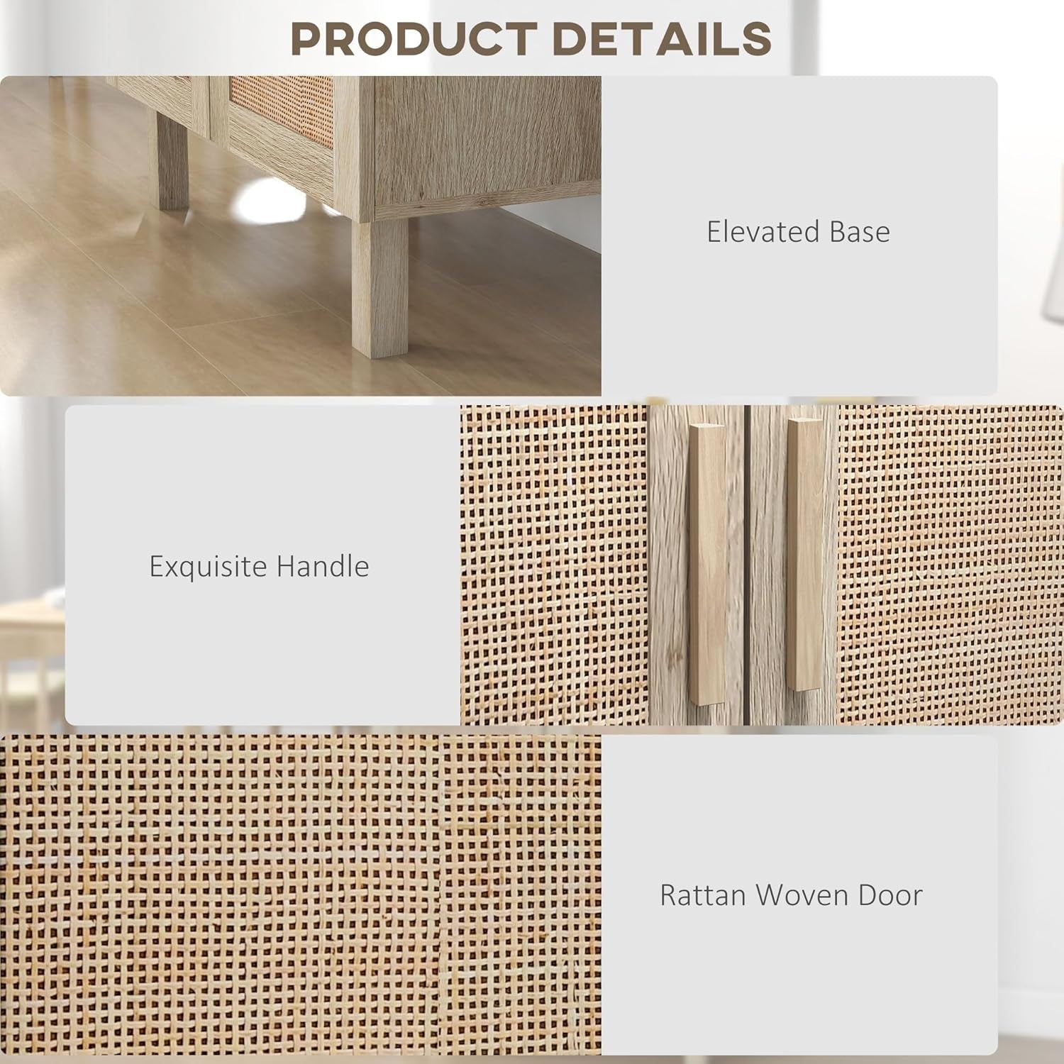This boho-inspired storage cabinet brings warmth and balance to your space with its woven rattan-style doors and clean, low-profile design. The natural finish adds softness and texture, making it an easy fit for kitchens, living rooms, entryways, or bedrooms—anywhere you need storage that feels intentional rather than utilitarian.